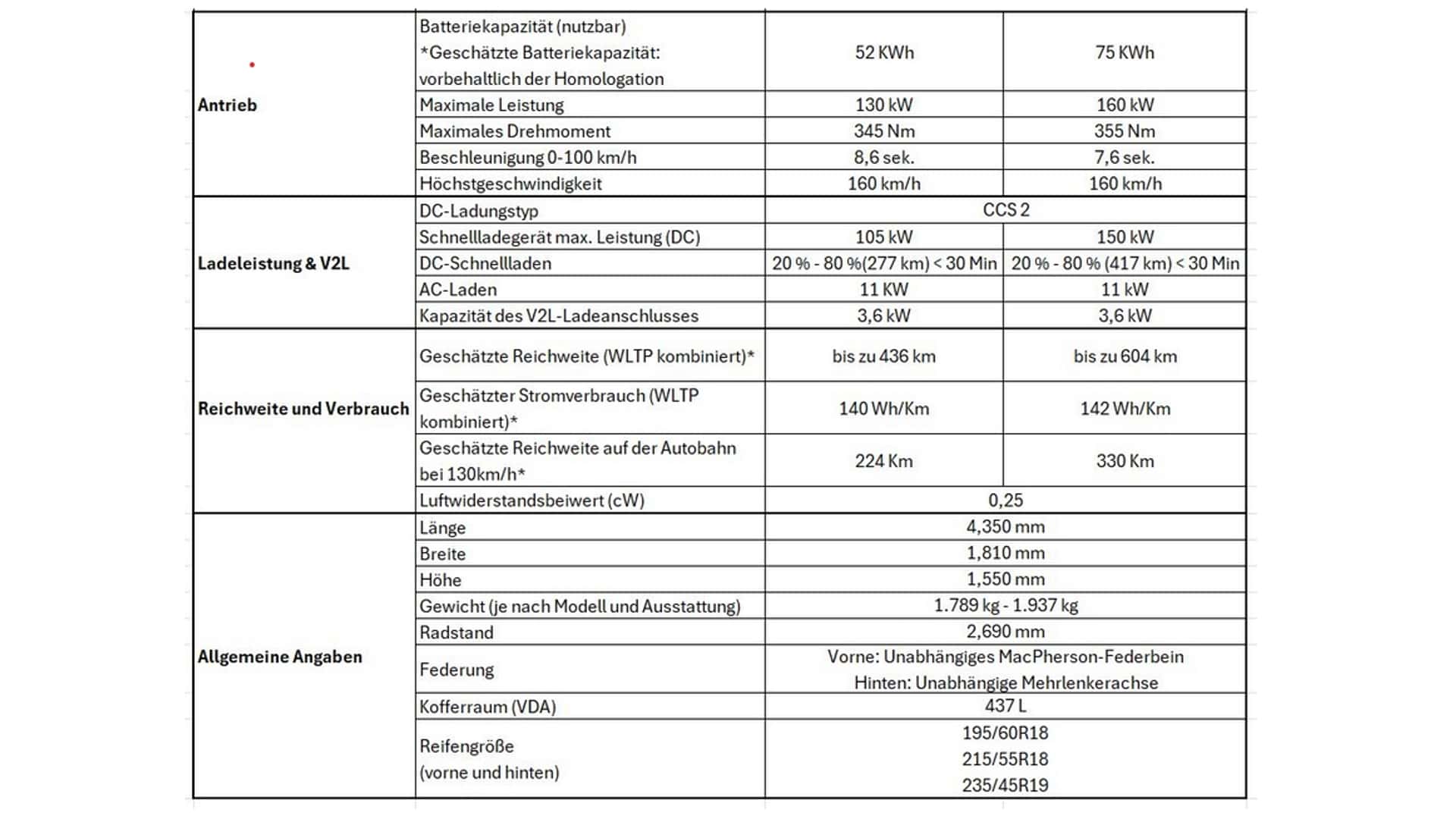 Технічно, Leaf, як і Ariya (а також Renault Megane E-Tech та Scenic E-Tech), базується на платформі CMF-EV. Ось усі ключові дані в табличному форматі: