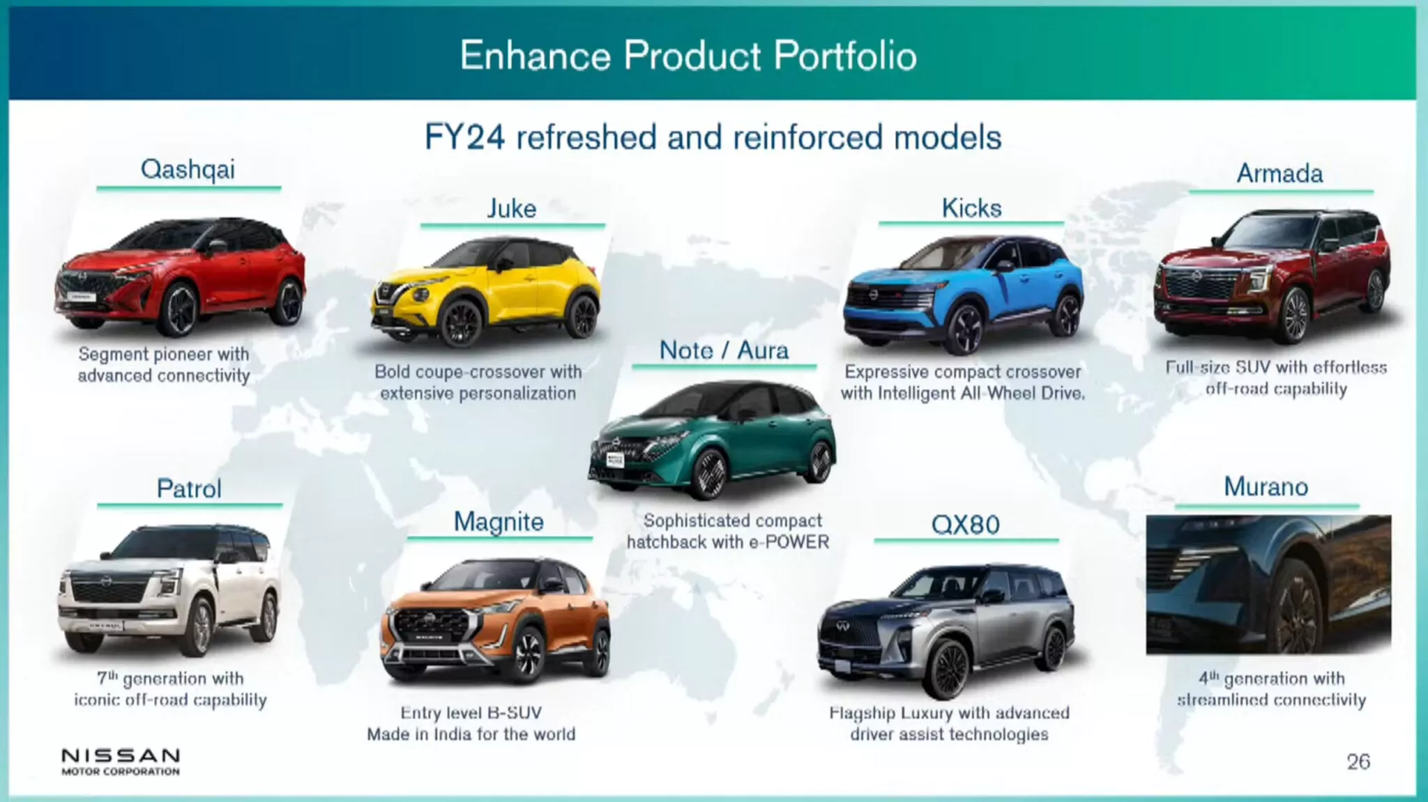 Крім того, у 2026 році Nissan представить в Японії оновлені автомобілі у стилі kei та великі мінівени. Ймовірно, це оновлені версії Dayz і Elgrand. Нарешті, останньою новою моделлю в слайд-шоу є електричний седан Nissan N7, який вже був представлений у Китаї.
